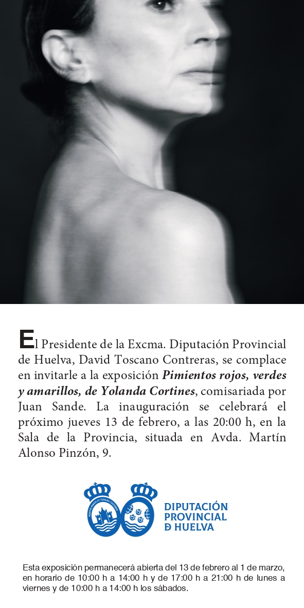 La Excma. Diputación Provincial de Huelva ofrece una nueva exposición en la Sala de la Provincia denominada “Pimientos rojos, verdes y amarillos”, que tendrá lugar desde el 13 de febrero hasta el 1 de marzo de 2.025. En esta ocasión se trata de una exposición fotográfica de la autora onubense Yolanda Cortines, cuyo trabajo transita entre la fotografía, las formas estructurales y la danza contemporánea. Esta muestra es un viaje hacia la esencia artística de la autora, donde confluyen experiencias personales, reflexiones emocionales y una búsqueda incesante de belleza en lo cotidiano.