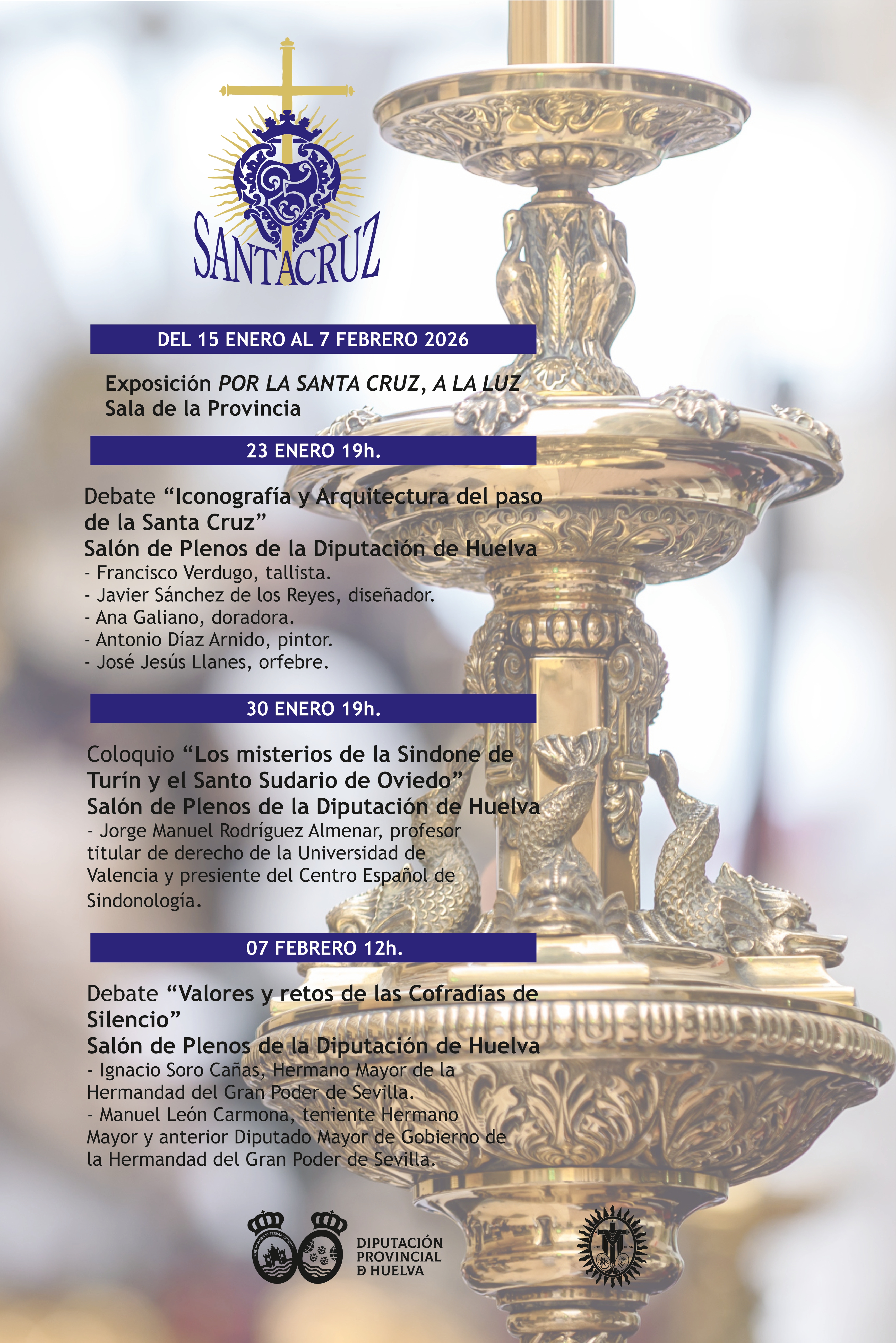 La Sala de la Provincia acoge la exposición Por la Santa Cruz, a la luz, una propuesta expositiva que se integra en el programa conmemorativo del XXV aniversario de la Erección Canónica de la Cofradía de la Santa Cruz. La muestra plantea un recorrido por el patrimonio material e inmaterial de la corporación, articulando una reflexión en torno al significado simbólico, artístico y devocional del mundo cofrade.