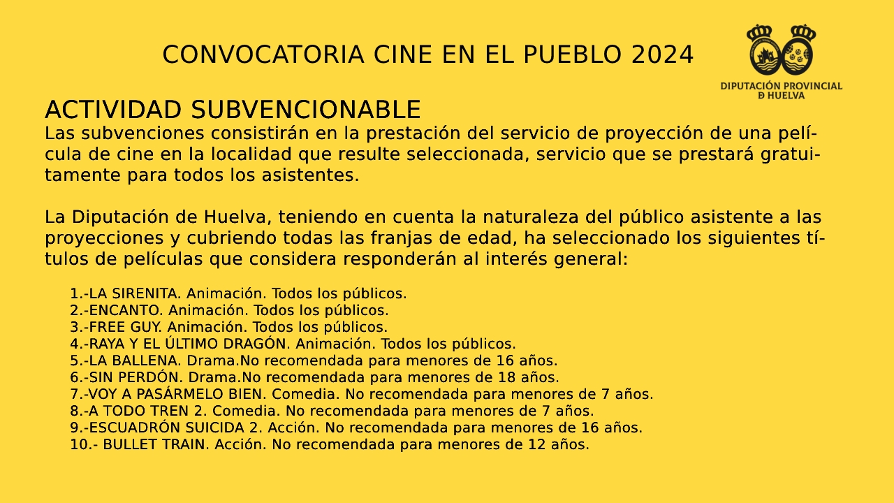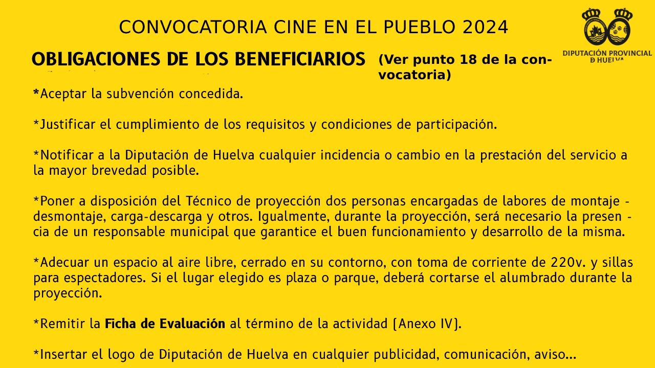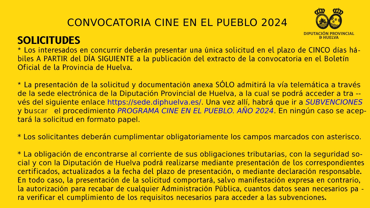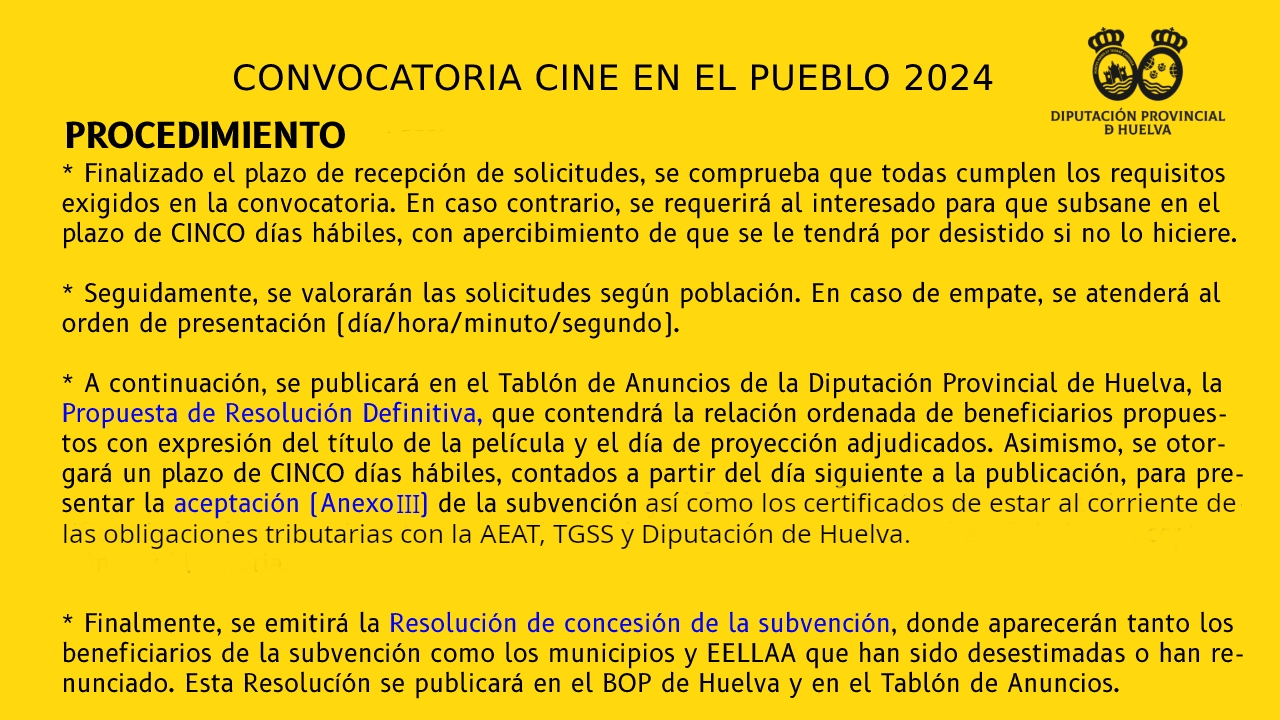 | 14/06/2024 | BOP | 116 | Anuncio | Publicación en extracto de la convocatoria de subvenciones en especie de la Diputación de Huelva, en régimen de concurrencia competitiva, Programa Cine en el Pueblo 2024. | 21/06/2024 |