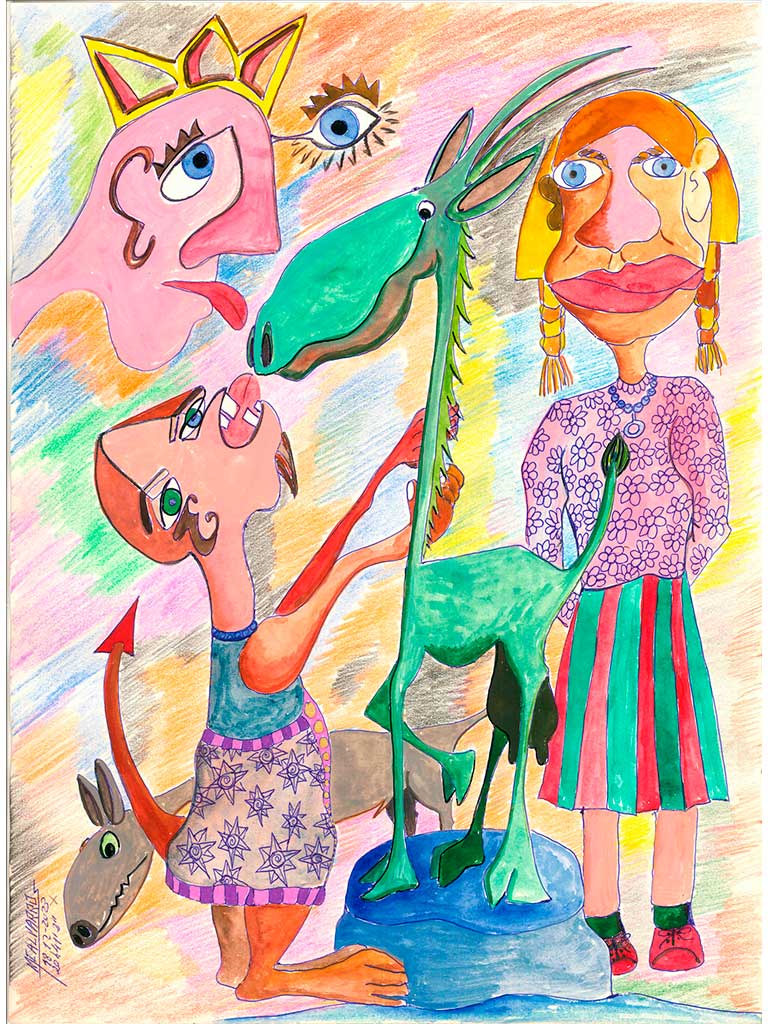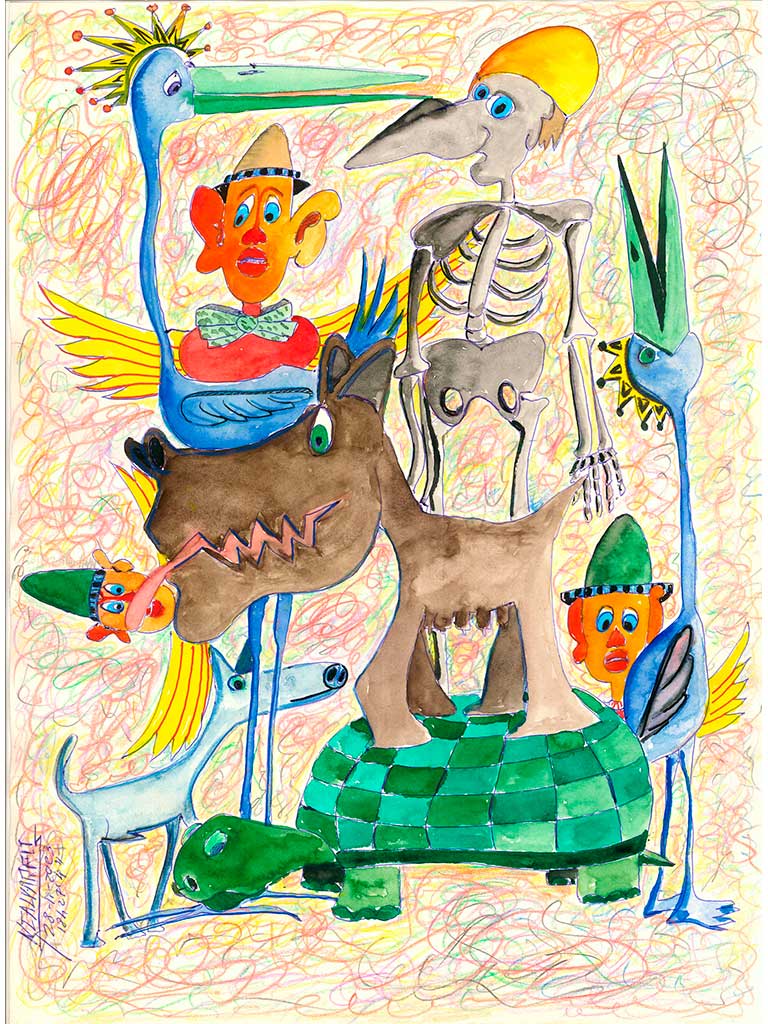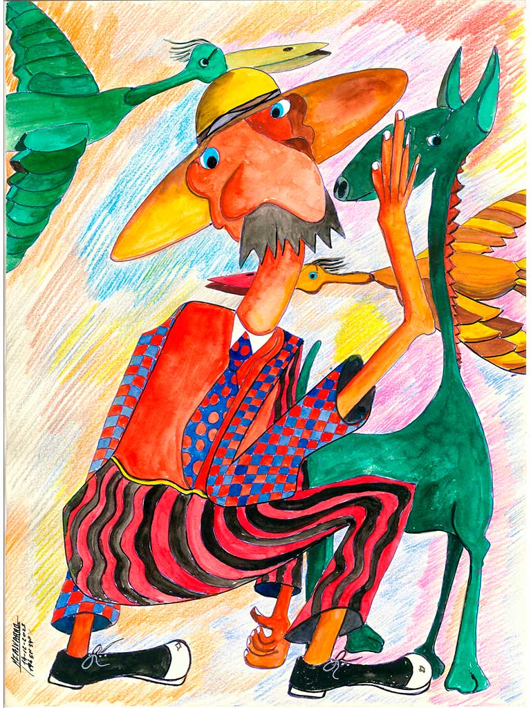 Su trabajo, surrealista y cotidiano, tierno y bruto, está repleto de guiños: a la naturaleza, a lo cotidiano, a lo fieramente humano. Sus volúmenes polícromos están preñados de locura, de calidez. En el mismo papel puede mezclar un perro con una escalera, una virgen con una peonza, un cactus con una canción, y todo cobra sentido —o mejor dicho, sentido del suyo—. Porque no busca gustar. Busca decir. O más bien, jugar. El suyo es un arte que no pide permiso. Que se lanza como quien se tira a una cuesta abajo en bicicleta, sin frenos, con el viento en la cara y Extremoduro en los oídos.