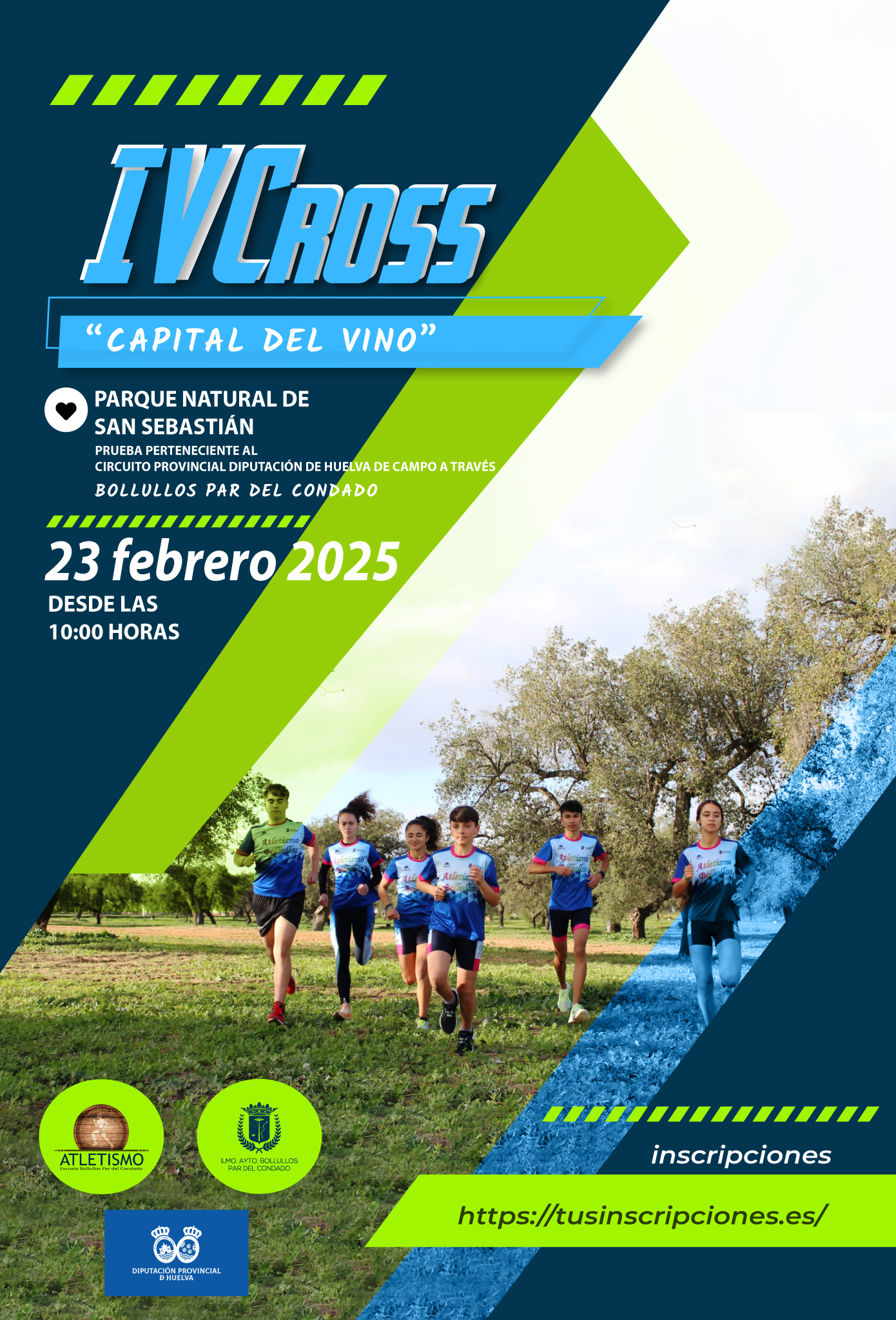 La Concejalía de Deportes del Ilustrísimo Ayuntamiento de Bollullos Par del Condado, con la colaboración de la Diputación Provincial de Huelva, F.A.A a través de la Delegación Onubense de la Federación Andaluza de Atletismo, Escuela de Atletismo de Bollullos Par del Condado, organiza el próximo 23 de Febrero de 2025 el IV CROS CIUDAD DE BOLLULLOS – CAPITAL DEL VINO