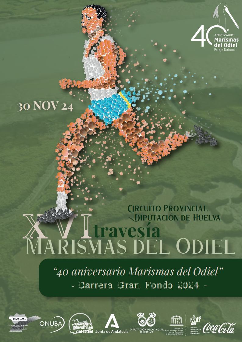 La Delegación Territorial en Huelva de la Consejería de Sostenibilidad y Medio Ambiente, Paraje Natural “Marismas del Odiel", organiza el sábado 30 de noviembre de 2024 la carrera popular “XVI TRAVESÍA MARISMAS DEL ODIEL”. Prueba puntuable para el Circuito Gran Fondo Diputación Provincial de Huelva.