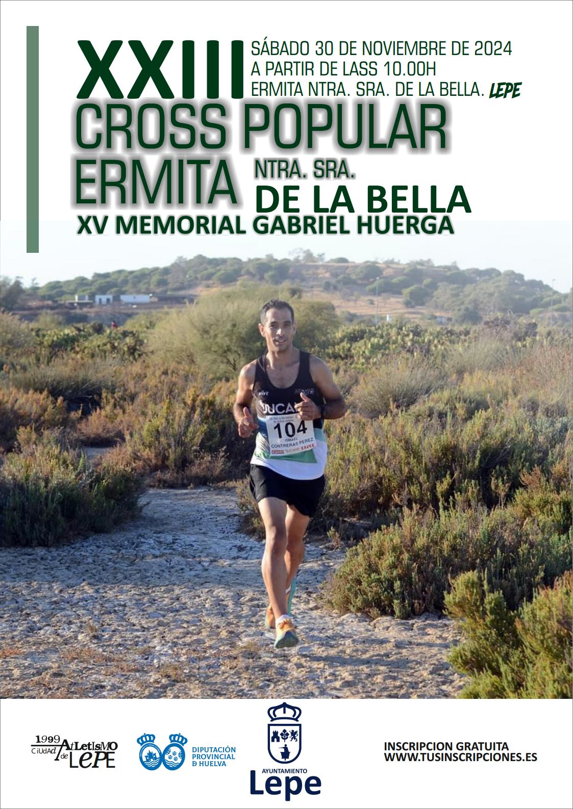 El Excmo. Ayuntamiento de Lepe, a través del Servicio de Deportes, en colaboración con el Club de Atletismo Ciudad de Lepe, organiza la 23a Edición del Cross Popular Ermita Ntra. Sra. de La Bella, XV Cross Corto Memorial 'Gabriel Huerga', prueba del Circuito Provincial de Campo a través de Diputación Provincial de Huelva 2024 que se celebrará el día 30 de noviembre de 2024 a partir de las 10h.
