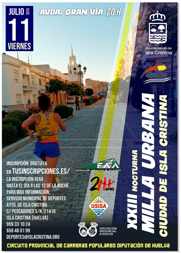La Concejalía de Deportes del Ilustrísimo Ayuntamiento de Isla Cristina organiza el próximo 11 de julio de 2025 la XXIII MILLA URBANA NOCTURNA CIUDAD ISLA CRISTINA. Se llevará a cabo a partir de las 20 horas en la Avenida Gran Vía de la localidad.