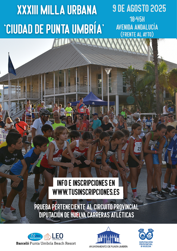 - La XXXIII Milla Urbana "Ciudad de Punta Umbría", está organizada por el Servicio Municipal de Deportes del Ayuntamiento de Punta Umbría con la colaboración de la Diputación Provincial de Huelva y de la Delegación Onubense de Atletismo y del Club Atlético Punta Umbría.La prueba tendrá lugar el sábado 9 de agosto de 2025 y comenzará a las 18:45 horas con la categoría Pequeños. Se desarrollará en su totalidad en un circuito urbano por la Avenida Andalucía, con salida y meta frente a la Plaza de la Constitución (Ayuntamiento).