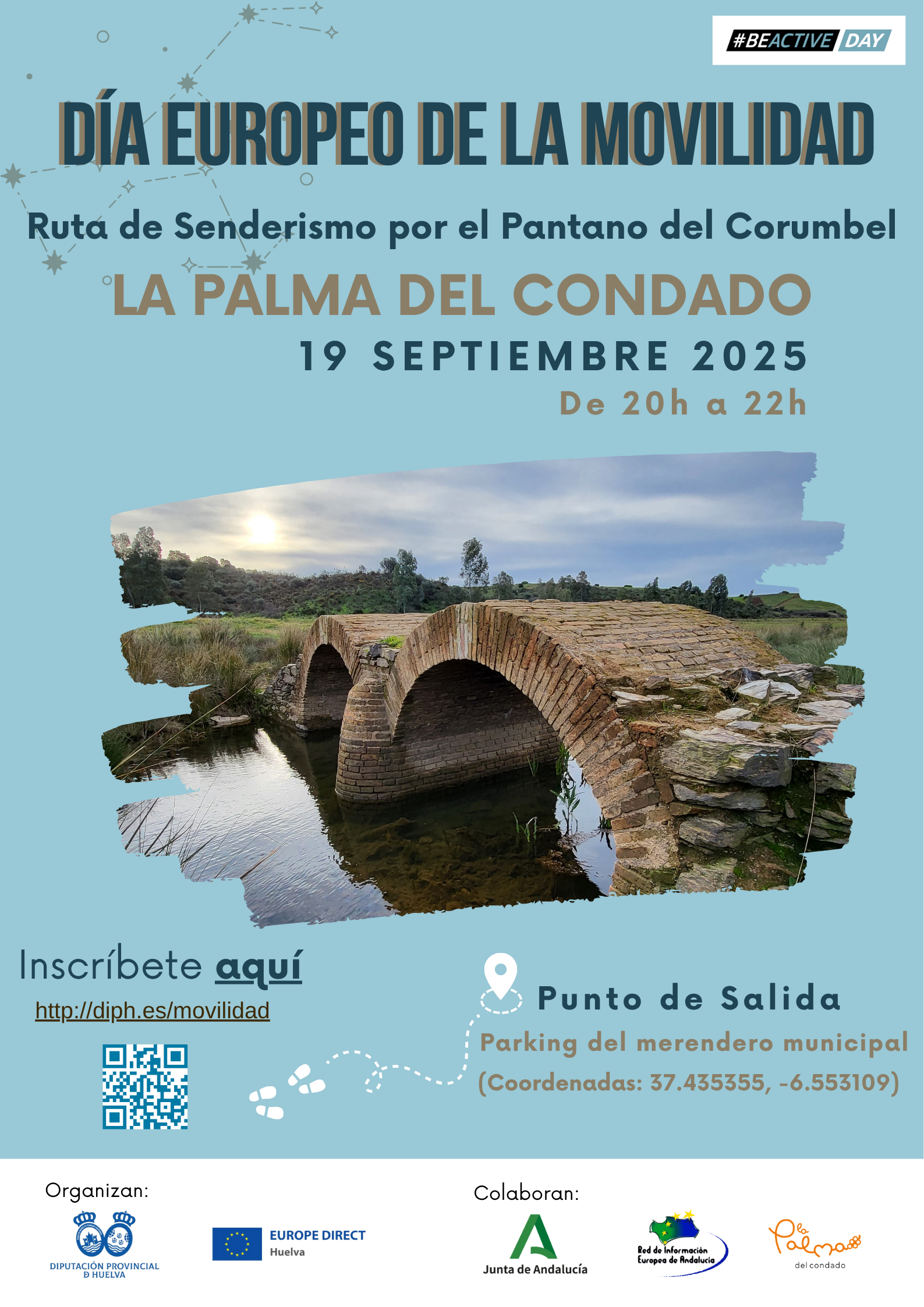 Con motivo de la celebración de la Semana Europea de la Movilidad del 16 al 22 de Septiembre, el Centro de Información Europea - ED Huelva, organiza el día 19 de Septiembre en el municipio de la Palma del Condado (Huelva) la "Ruta de Senderismo Bajo las Estrellas por el Pantano del Corumbel", en colaboración con el Ayuntamiento del municipio y la Red de Información Europea de Andalucía (RIEA).