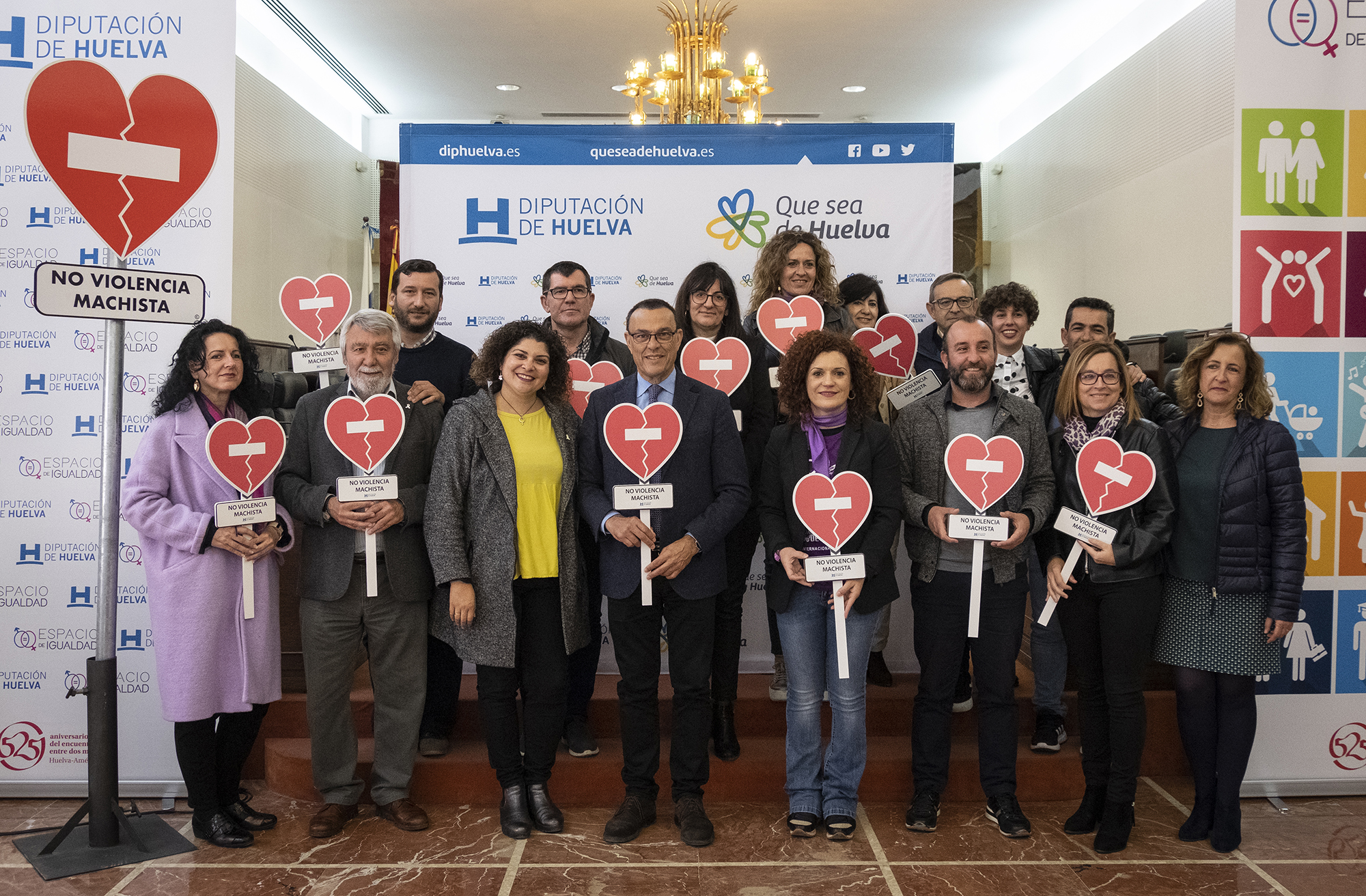 La Diputación de Huelva exhibe desde el 25 de julio de 2018 en la entrada de sus distintas sedes la señal 'No a la violencia machista', que identifica estos edificios públicos como espacios libres de violencia y como lugares de trabajo y de políticas activas contra la violencia hacia las mujeres.