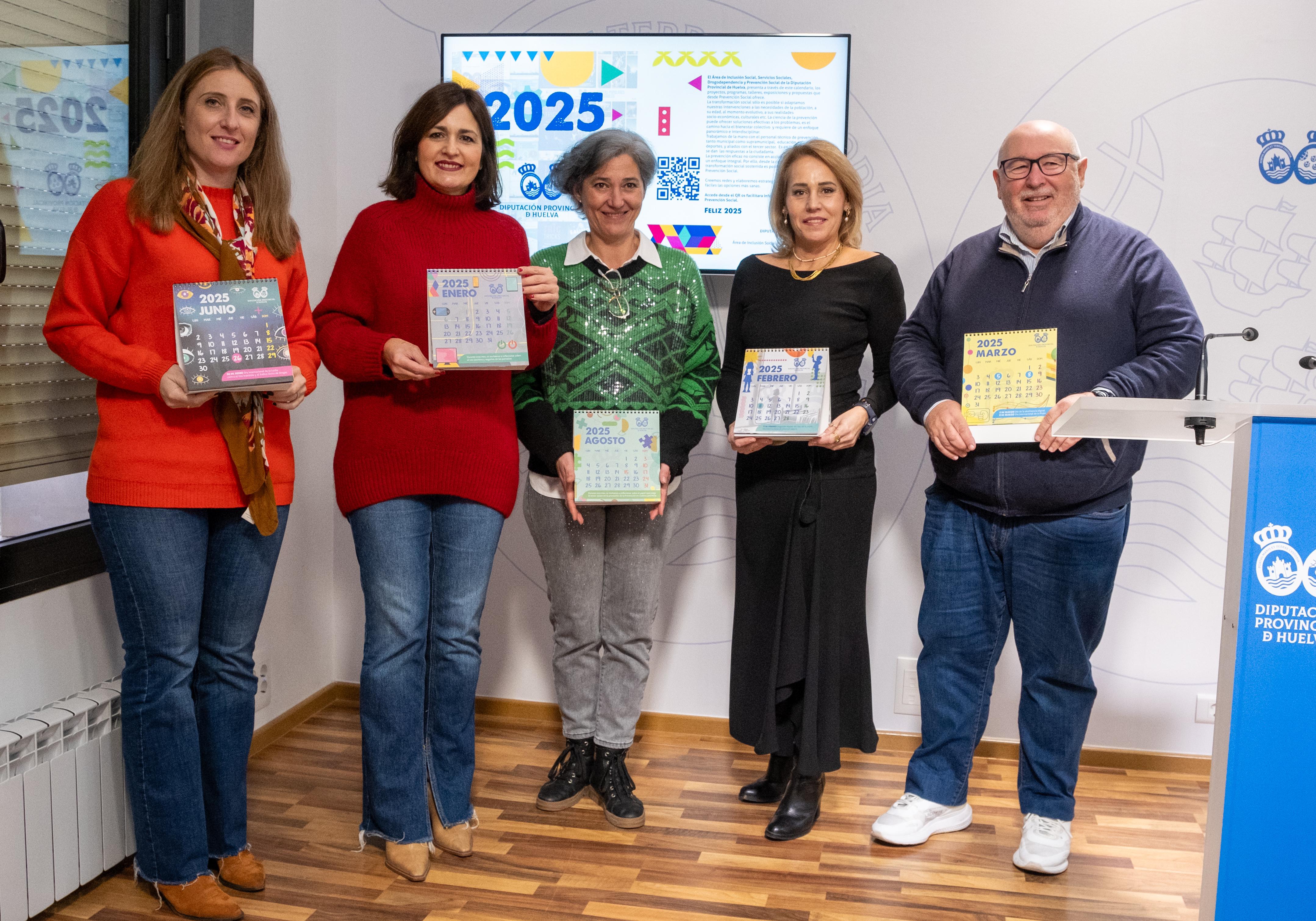 Con el objetivo de difundir y hacer accesible sus servicios de prevención social, la Diputación de Huelva ha presentado un calendario de 2025 que recoge los talleres y programas que se desarrollan a lo largo del año. “Es un catálogo que desde el área de Inclusión Social, Servicios Sociales, Drogodependencia y Prevención Social ofrecemos a toda la ciudadanía de la provincia de Huelva con la firme convicción de que la prevención es la puerta que lleva a la transformación social”, en palabras de la diputada del área, Carmen Díaz, que ha estado acompañada por el personal técnico del Área de Prevención Social.