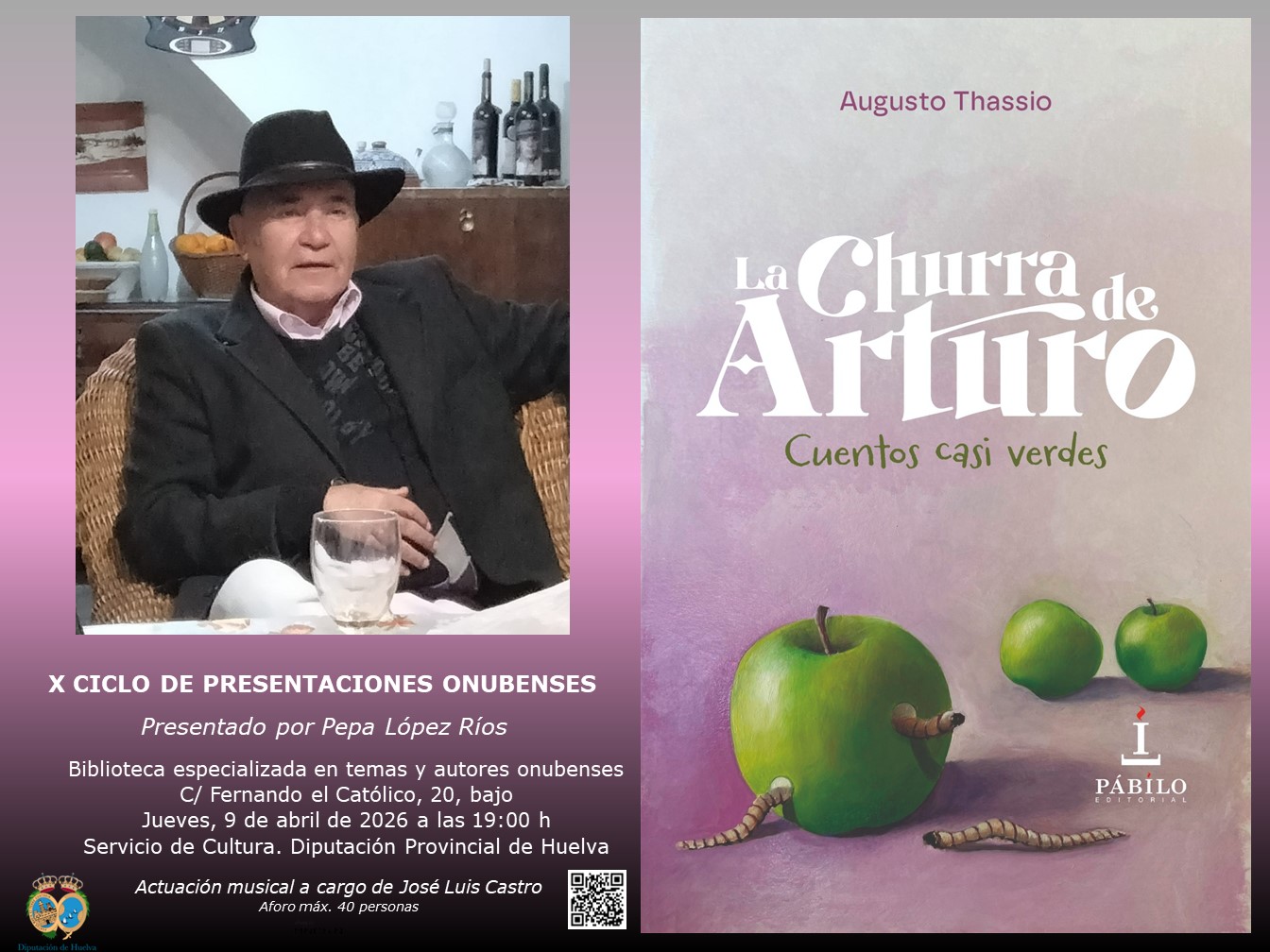 El jueves 9 de Abril a las 19:00 horas, presentará Pepa López Ríos su libro, La churra de Arturo: cuentos casi verdes, con la actuación musical de José Luis Castro, en la Biblioteca de Temas y Autores Onubenses de la Diputación de Huelva.