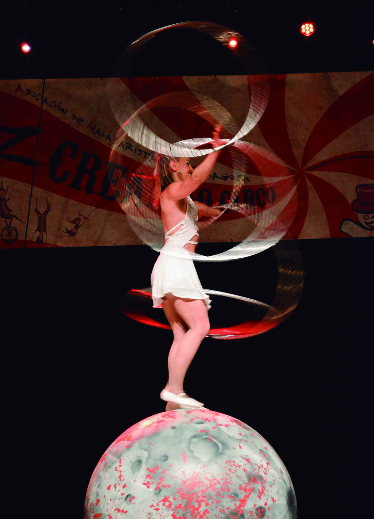 Eleni Ana es una artista de circo griega formada en la Escuela de Circo Carampa (Madrid) y establecida recientemente en Granada. Especialista en hula hoop y en equilibrios, principalmente sobre bola y en monociclo, también es intérprete de acordeón, aunque sobre todo destaca por contar con una habilidad inaudita para hacerlo todo al mismo tiempo. Sin descuidar la puesta en escena, las distintas creaciones de Eleni Ana siempre tienen un punto diferenciador y un claro anhelo por ir un paso más lejos a través del virtuosismo y la técnica circense. En este caso, Eleni Ana exhibe de forma explosiva todas sus habilidades a través de un número de disociación con base en el circo tradicional. Este acto se caracteriza por la firmeza en la técnica, la musicalidad y la dinámica presencia de una mujer en la escena. Bola, equilibrismo y hula hoops todo mezclado con armonía en un acto único que sorprenderá a todo el público.