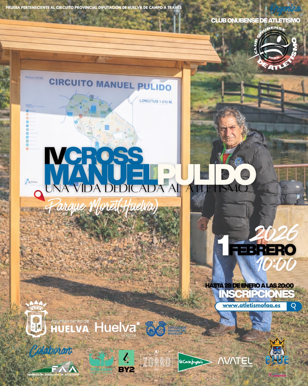 El Club Onubense de Atletismo organiza el IV Cross "MANUEL PULIDO", con la colaboración del Excmo Ayuntamiento de Huelva, Diputación de Huelva y Federación Andaluza de Atletismo.