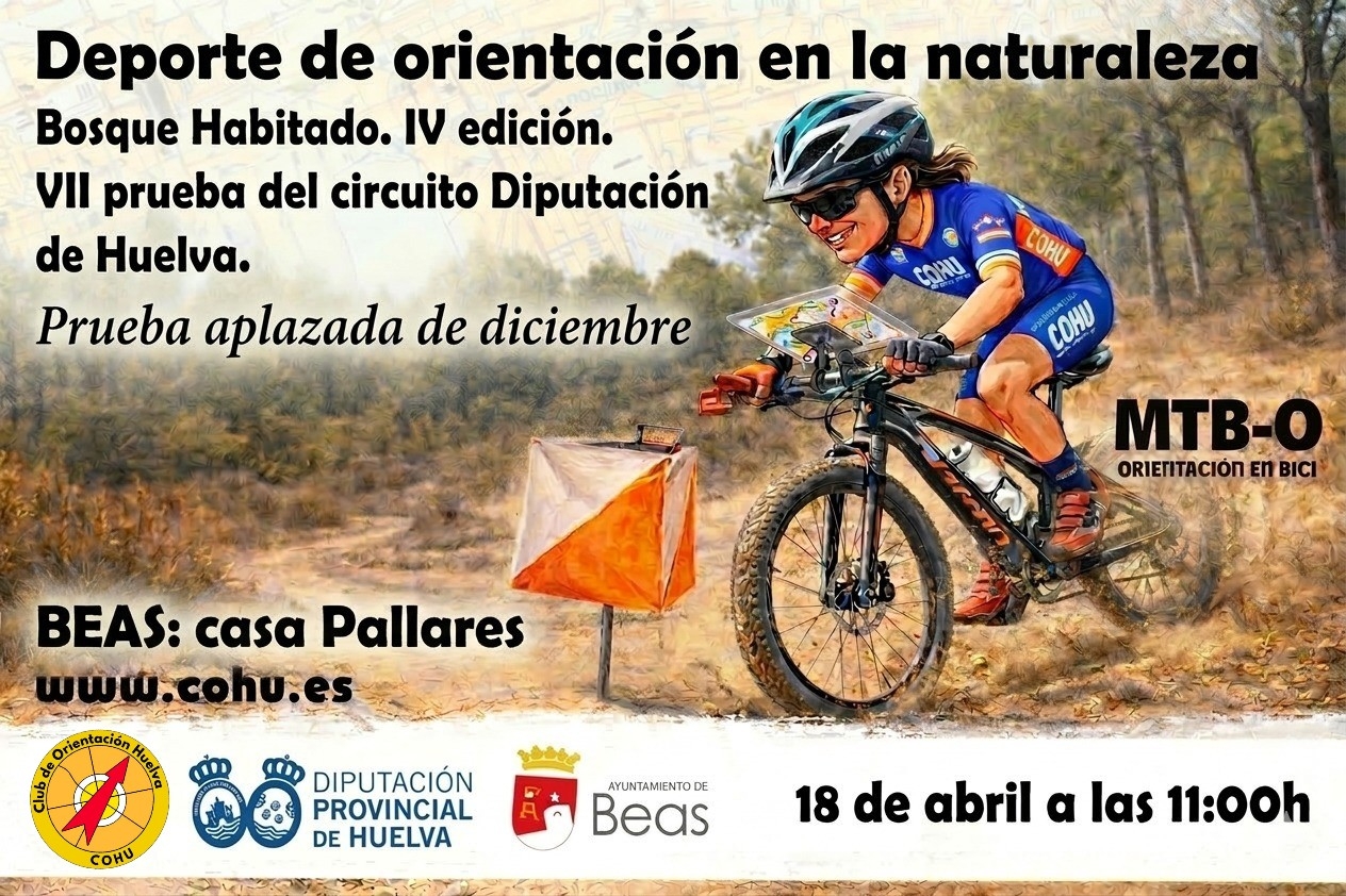 El próximo Sábado 18 de Abril se celebrará la Séptima prueba, aplazada de diciembre, de El Bosque Habitado 2025, el circuito provincial de orientación de Huelva que organiza el club COHU junto a la Diputación de Huelva y la colaboración del Ayuntamiento de la localidad. En esta ocasión viajamos al término municipal onubense de BEAS, dirección Fuente La Corcha en la modalidad de MTBO. ¡¡Os esperamos!!!