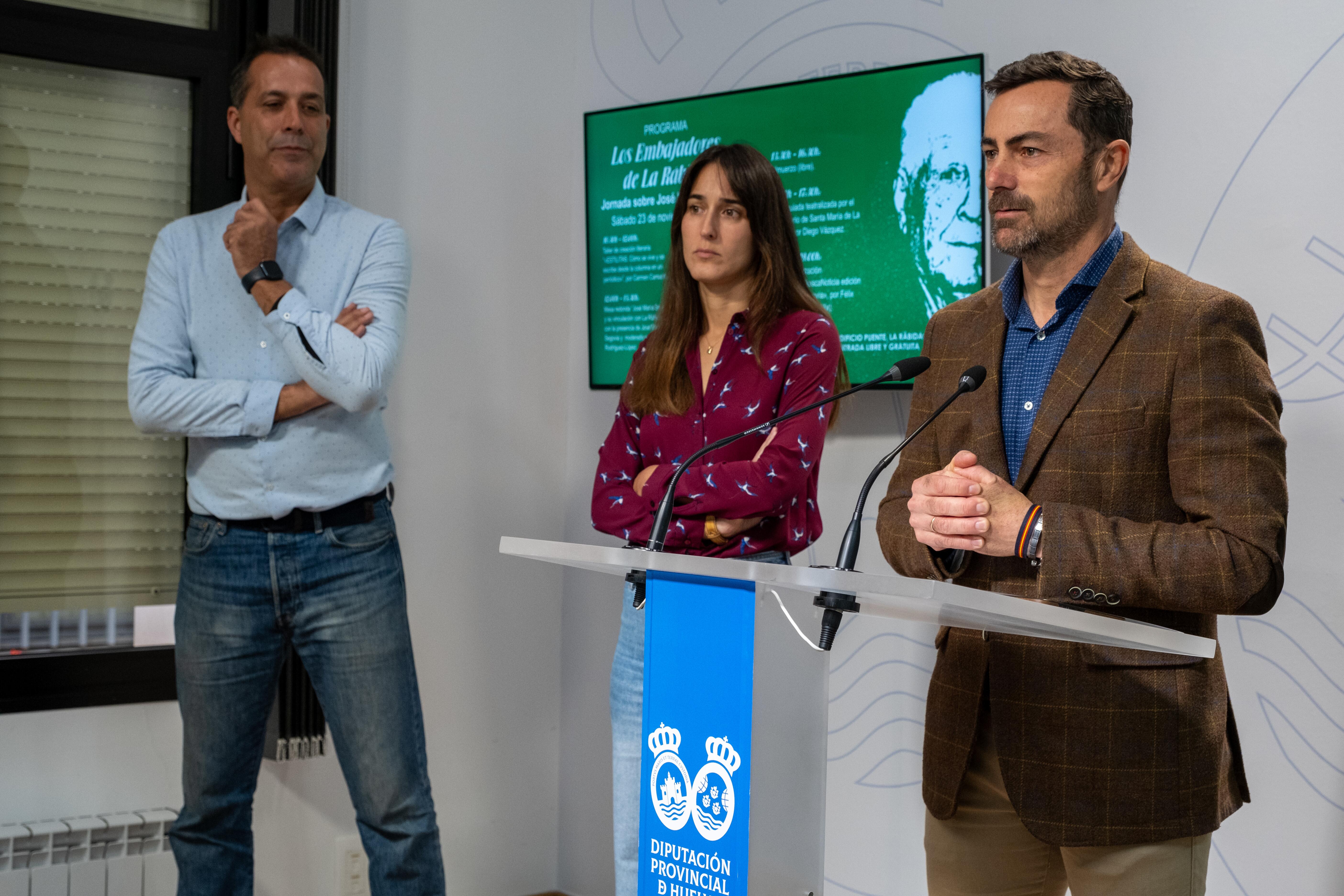 La sala de prensa de la Diputación ha acogido la presentación de la tercera edición del programa ‘Los Embajadores de La Rábida’, puesto en marcha desde la Unidad de Gestión de La Rábida (UGR) de la institución provincial. El diputado de la UGR, Juan Daniel Romero, junto a la directora del programa, Jennifer Rodríguez, y el director de la UGR, Agustín Medina, han dado a conocer el programa de actividades diseñadas para el próximo 23 de noviembre, en el Edificio Puente de La Rábida, junto al Parque Botánico Celestino Mutis.